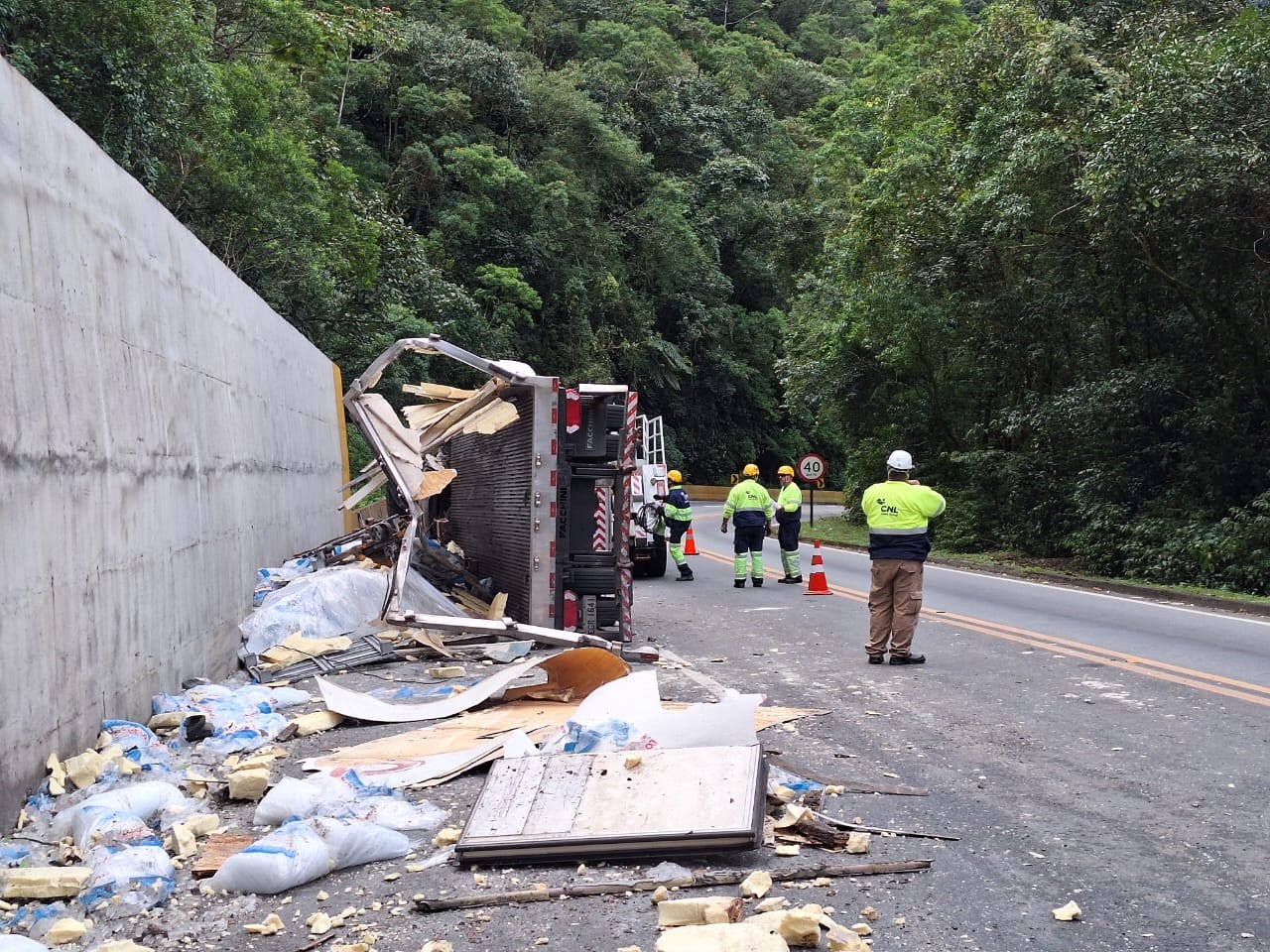 Um pouco mais adiante, próximo ao quilômetro 84, o caminhão bateu contra um muro de concreto e separou a cabine e o baú do veículo. A CNL, concessionária que administra a Mogi-Bertioga, atua na remoção do caminhão e da carga.