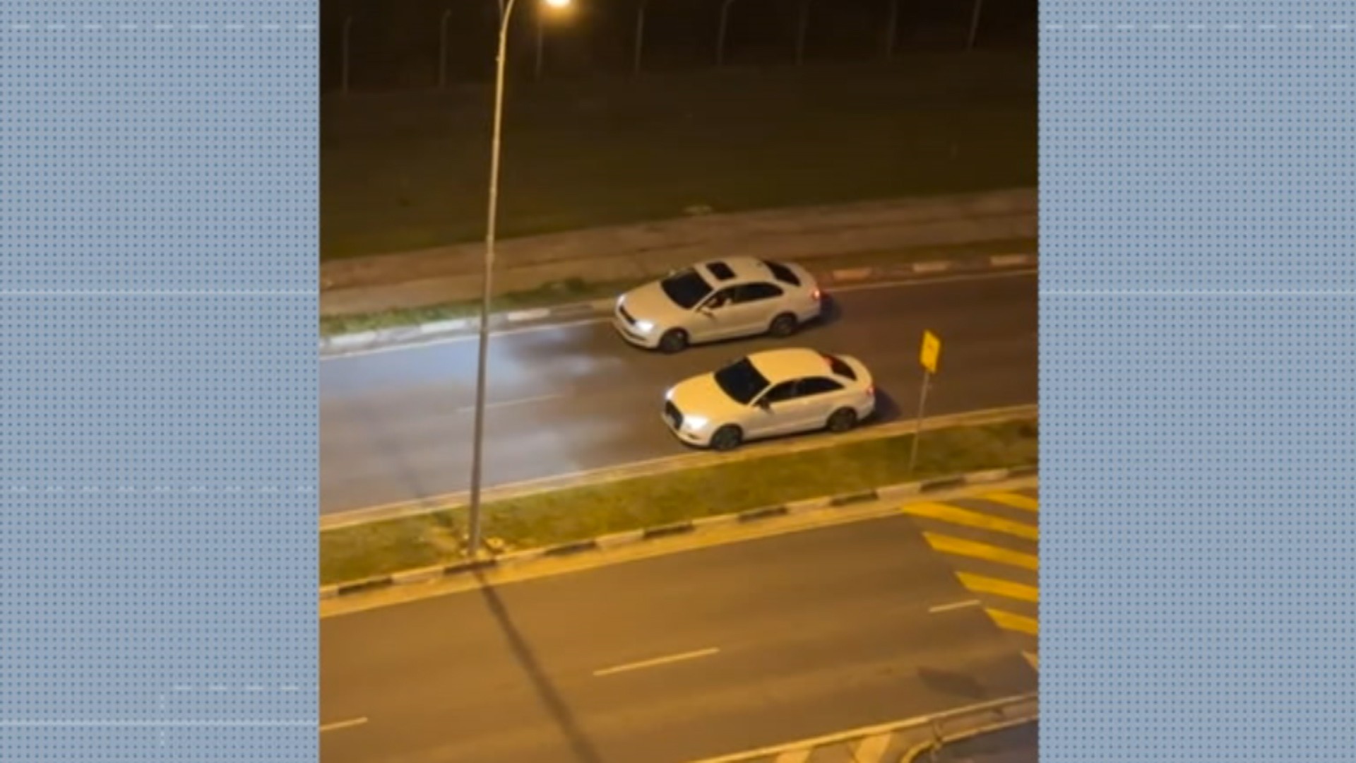 As imagens registradas na segunda-feira (30) mostram o momento em que dois veículos brancos se aproximam e ficam um ao lado do outro. Uma motocicleta chega a passar entre os dois carros, enquanto os dois motoristas conversam. Poucos segundos depois, ambos aceleram.